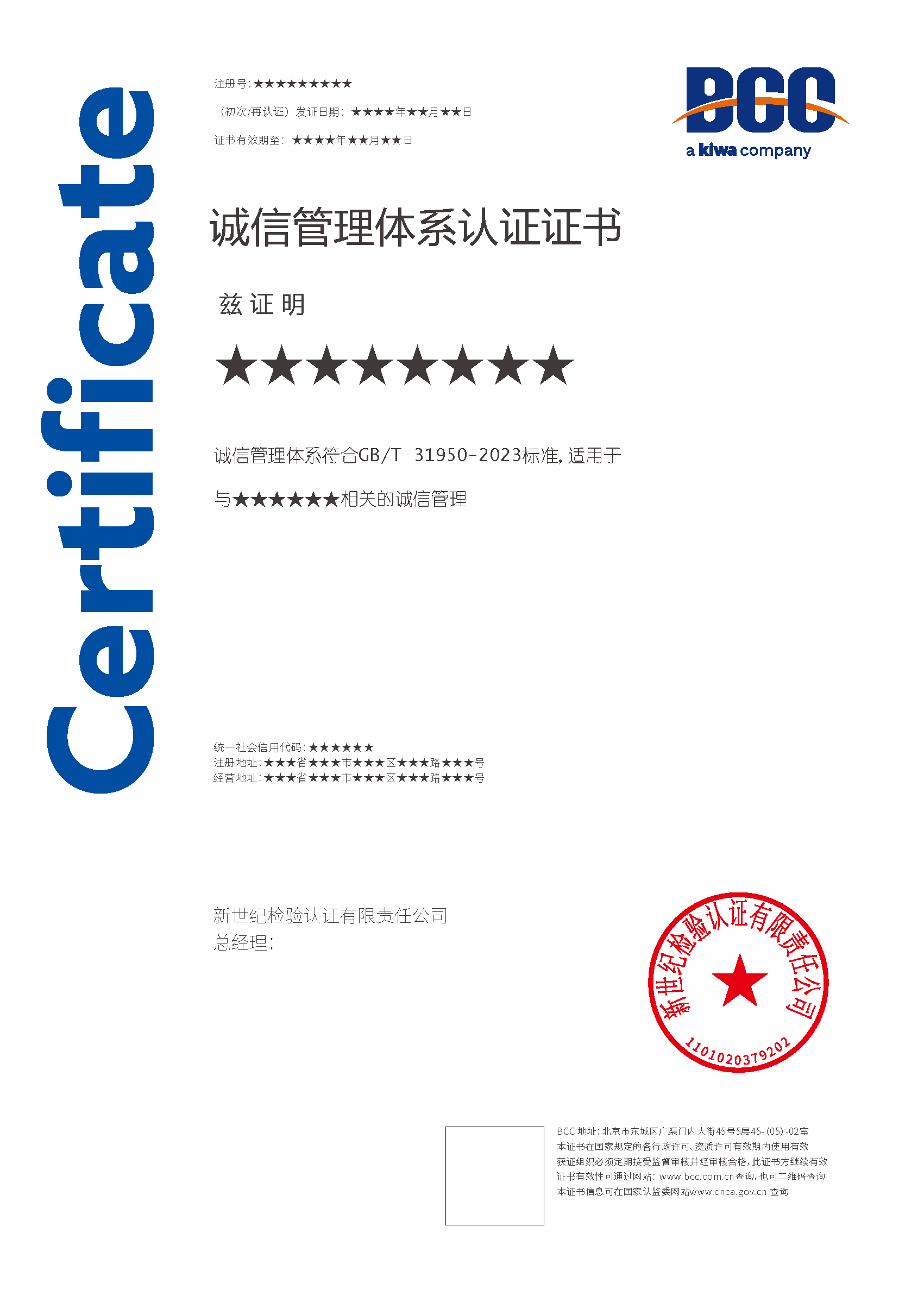 本頁涉及的認證服務中均有對應的《認證實施規(guī)則》,BCC擁有其最終解釋權。任何組織及個人未經BCC許可,不得以任何形式全部或部分使用(法律要求除外)認證相關信息。如需獲取相關實施規(guī)則請用以下方式聯(lián)系獲?。弘娫挘?10-58579316 郵箱:fwjs@kiwa.cn