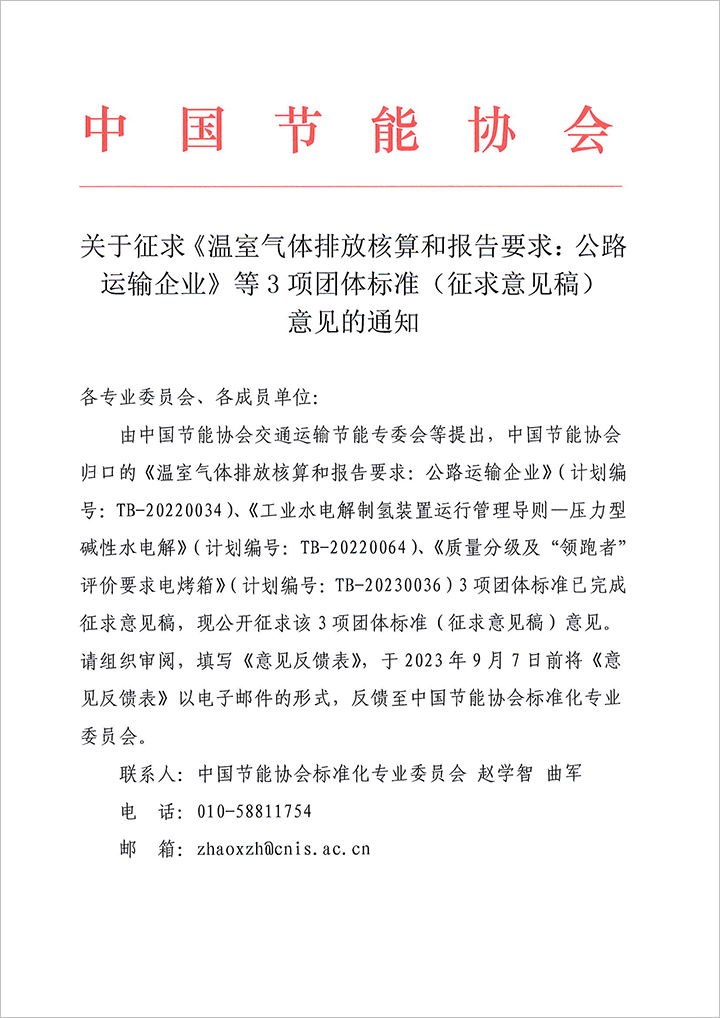關(guān)于征求《溫室氣體排放核算和報告要求:公路運(yùn)輸企業(yè)》等3項(xiàng)團(tuán)體標(biāo)準(zhǔn)(征求意見稿)意見的通知