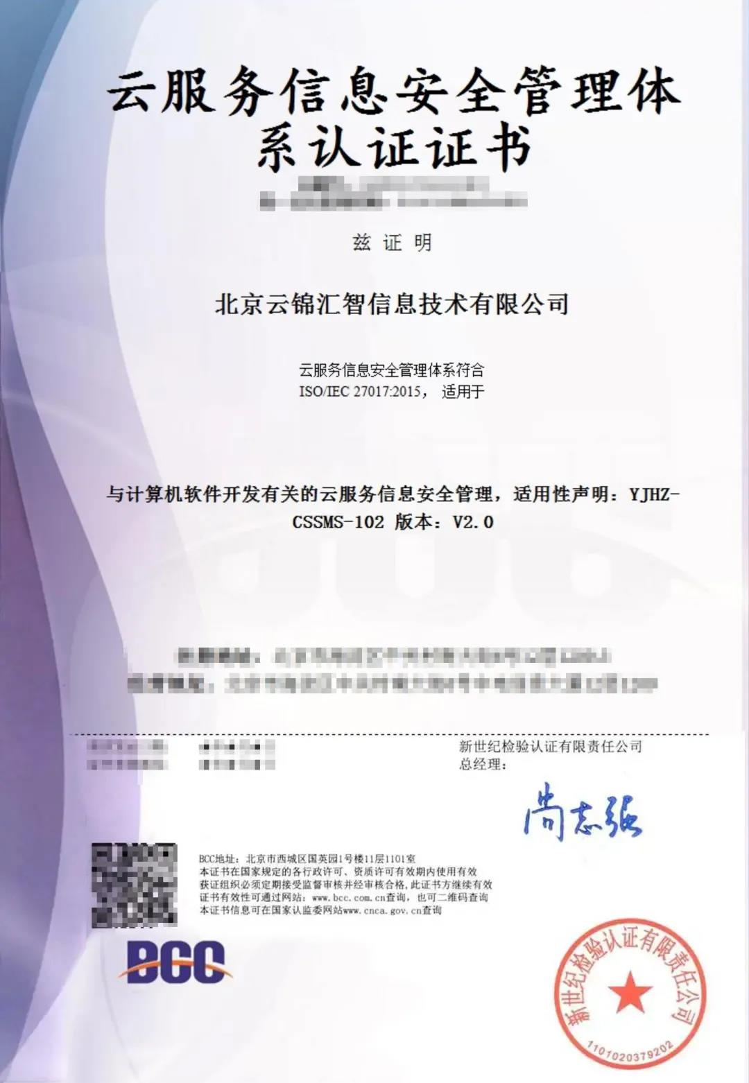 云錦匯智通過 ISO27017云服務(wù)信息安全管理體系認證