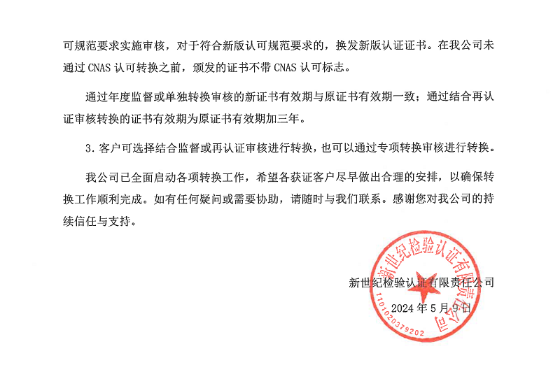 2.2024年6月1日起,我公司不再實施基于舊版認可規(guī)范的審核,開始按照新版認可規(guī)范要求實施審核,對于符合新版認可規(guī)范要求的,換發(fā)新版認證證書。在我公司未通過CNAS認可轉(zhuǎn)換之前,頒發(fā)的證書不帶CNAS認可標(biāo)志。