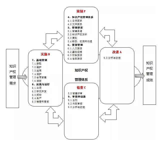《企業(yè)知識(shí)產(chǎn)權(quán)管理規(guī)范》的國(guó)家標(biāo)準(zhǔn)以PDCA(策劃、實(shí)施、檢查、改進(jìn))循環(huán)管理模型為理論基礎(chǔ),以基于過(guò)程方法的知識(shí)產(chǎn)權(quán)管理模型為構(gòu)建基礎(chǔ),明確以企業(yè)為對(duì)象,從企業(yè)知識(shí)產(chǎn)權(quán)管理策劃出發(fā),明確企業(yè)產(chǎn)品研發(fā)、擴(kuò)大市場(chǎng)、防范風(fēng)險(xiǎn)、提高效益等知識(shí)產(chǎn)權(quán)需求。