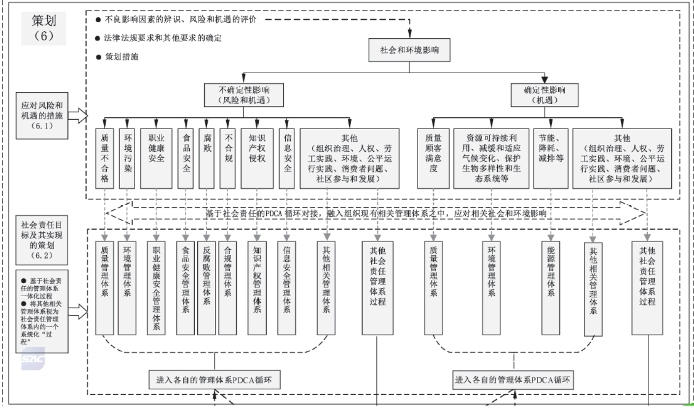 使組織能夠以社會責(zé)任為抓手,從頂層治理(價(jià)值觀、使命、精神和發(fā)展戰(zhàn)略等)視野出發(fā),統(tǒng)領(lǐng)、規(guī)范、協(xié)調(diào)和融合組織內(nèi)其他相關(guān)管理體系(如質(zhì)量管理體系、 環(huán)境管理體系、職業(yè)健康安全管理體系、食品安全管理體系、反腐敗管理體系、合規(guī)管理體系、知識產(chǎn)權(quán)管理體系、信息安全管理體系等),有效實(shí)現(xiàn)組織管理體系的一體化。
